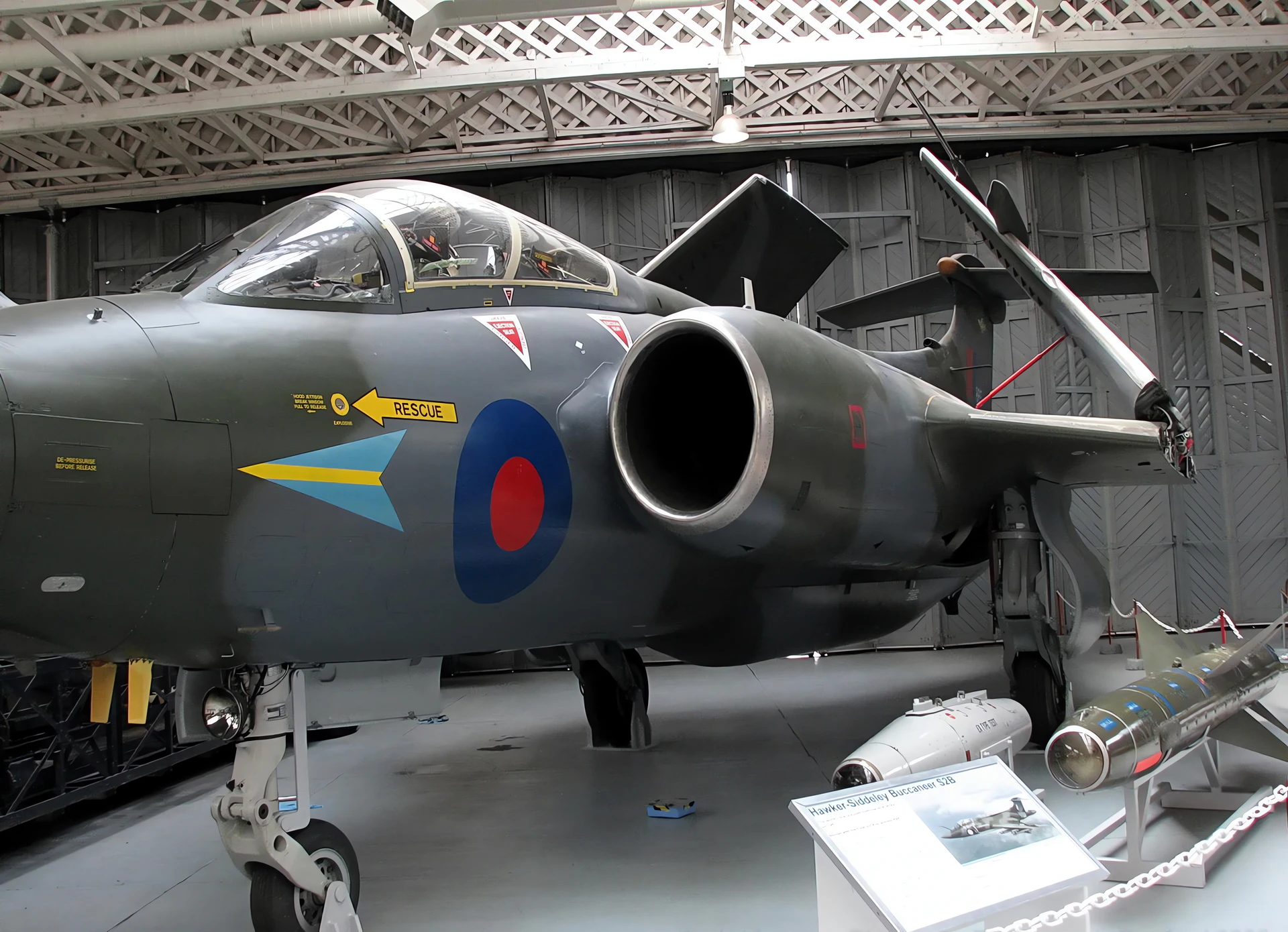 Fotogalerie Blackburn Bukanýr in Imperial War Museum Duxford, The Blackburn Buccaneer was a Royal Navy (RN) carrier-borne attack aircraft designed in the 1950s. Designed and initially produced by Blackburn Aircraft at Brough, it was later officially known as the Hawker Siddeley Buccaneer when Blackburn became a part of the Hawker Siddeley group, but this name was rarely used.