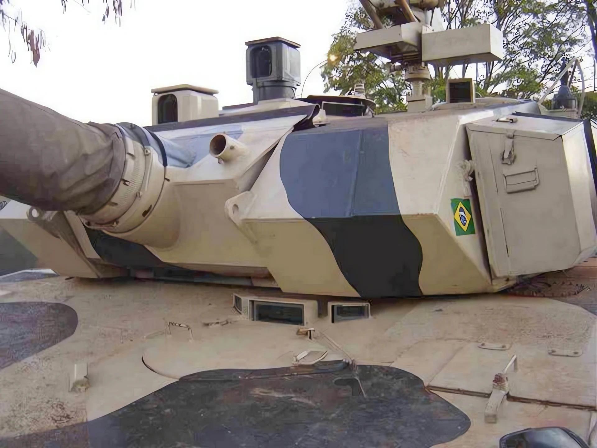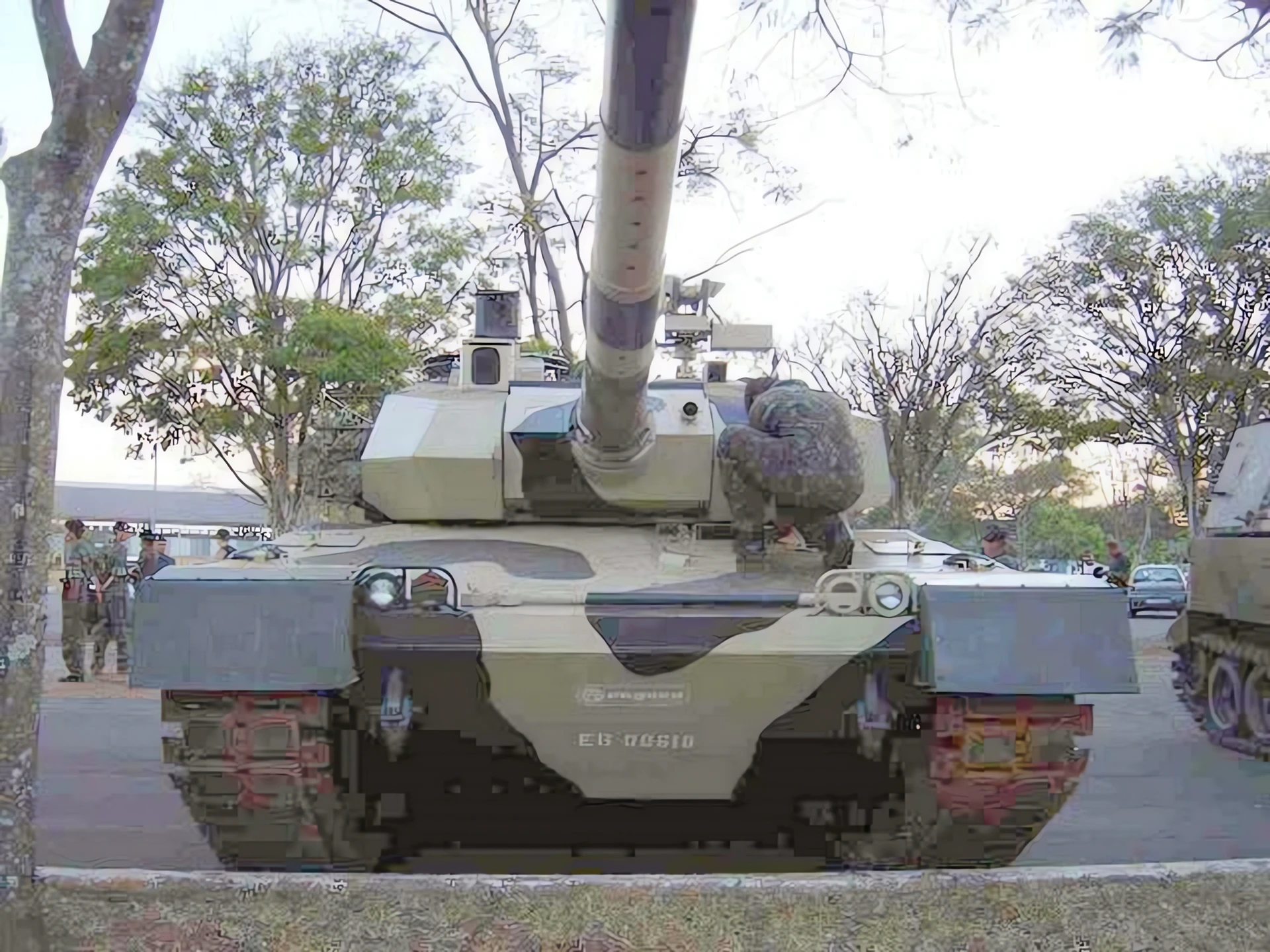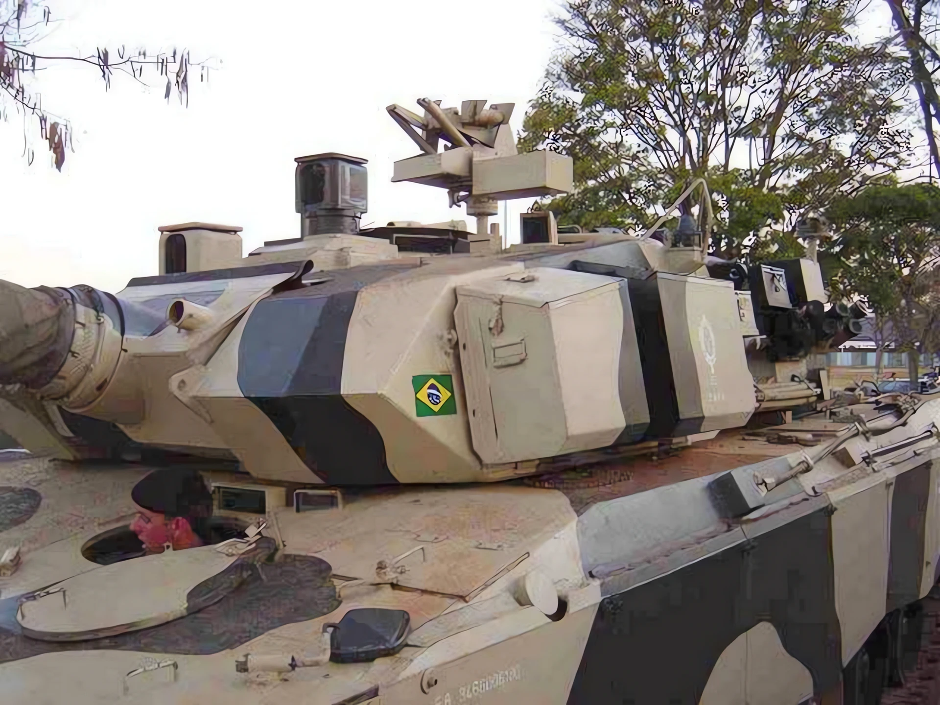 Armor: Modular, multi-layered composite armor developed by Engesa. The design utilized aluminum and composite ceramics to offer protection against both kinetic energy (KE) and chemical energy (CE) threats, comparable to contemporary Western MBTs but at a significantly lower weight.