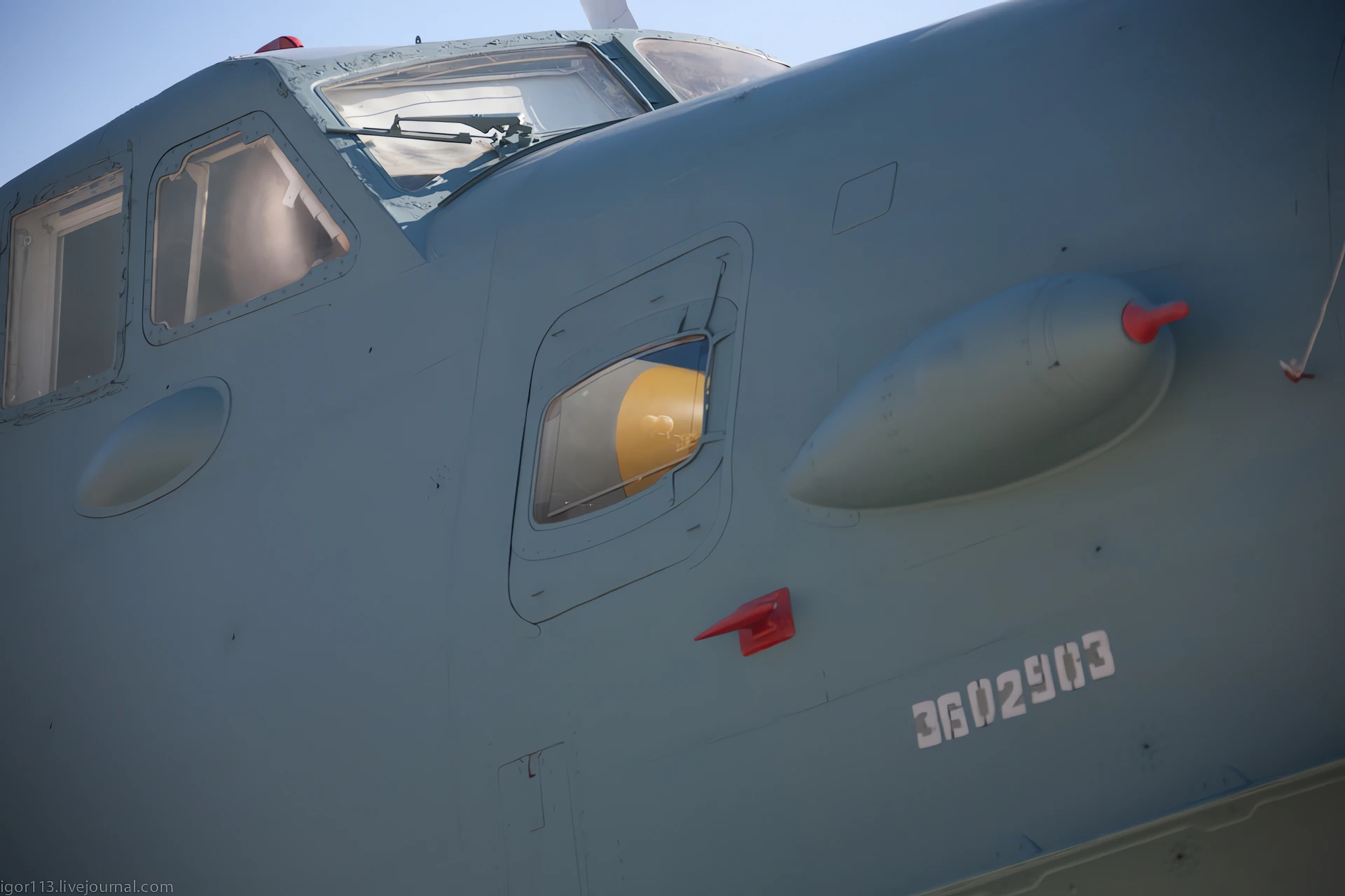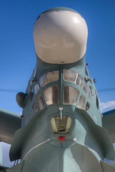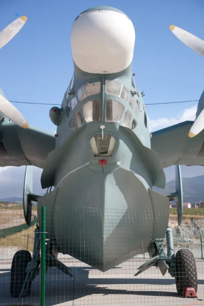 Spray Dams and Strakes:The nose of the Be-12 is fitted with “spray dams”—long metal strips that deflect water away from the cockpit windows and engine intakes during high-speed taxiing on water.
