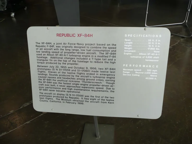 Lla République XF-84H « Thunderscreech (Thunderscreech) » était un avion à turbopropulseurs expérimental dérivé du F-84F Thunderstreak. Propulsé par un moteur à turbine qui a été atteté à une hélice supersonique, le XF-84H avait le potentiel d’établir le record officieux de vitesse aérienne pour les aéronefs à hélices, mais n’a pas été en mesure de surmonter les lacunes aérodynamiques de dentition, ce qui a donné lieu au programme.’s annulation